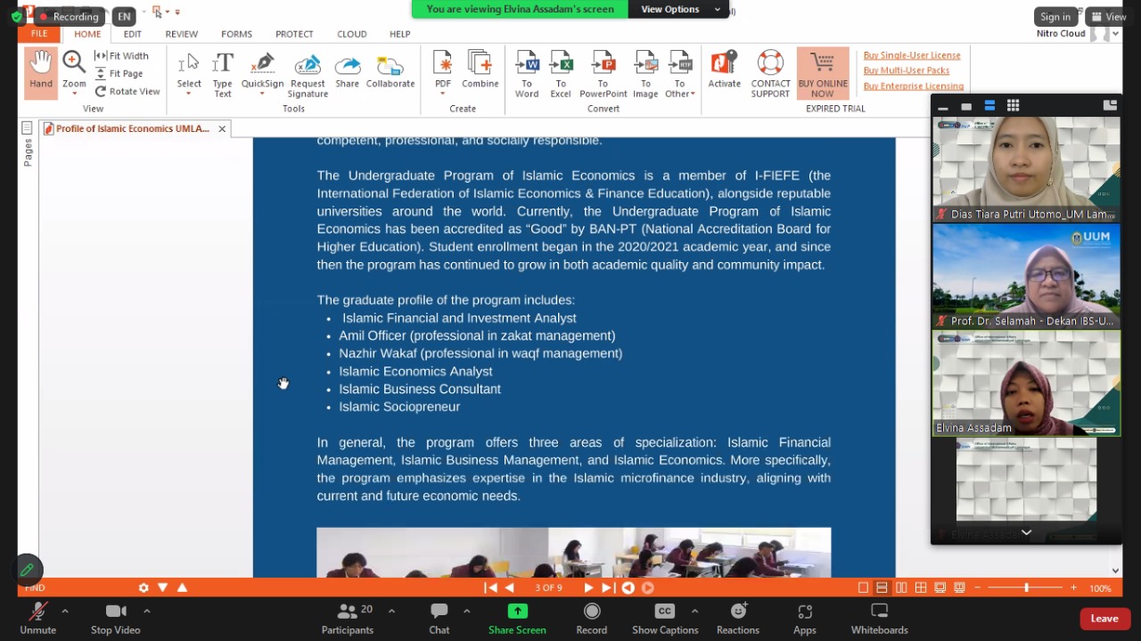 The session was attended by UMLA’s Vice Rector I, Dr. Arifal Aris; Head of International Office, Dias Tiara Putri Utomo, M.Pd; Dean of the Faculty of Economics and Business, Suyitno, M.M; Head of Islamic Economics Program, Elvina Assadam; and Deputy Head of Program, Faricha Maf’ula. Representatives from UUM’s Islamic Business School also joined and expressed strong interest in the collaboration.